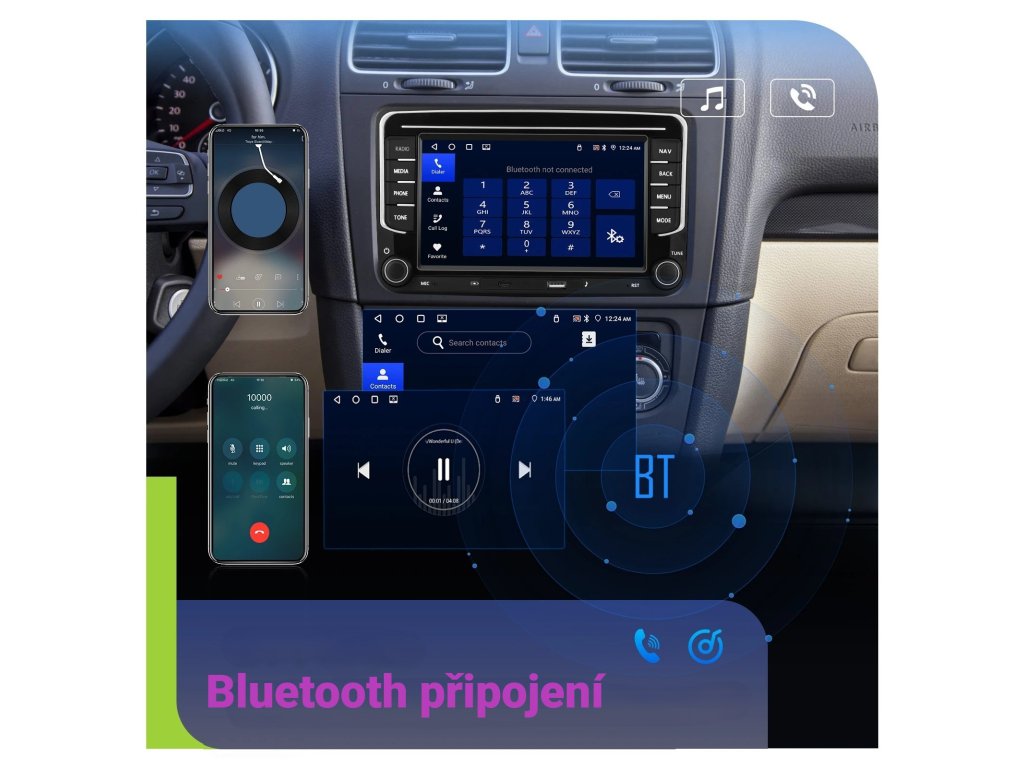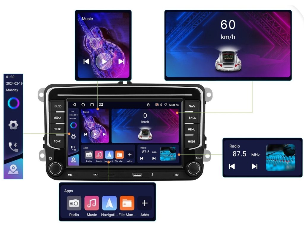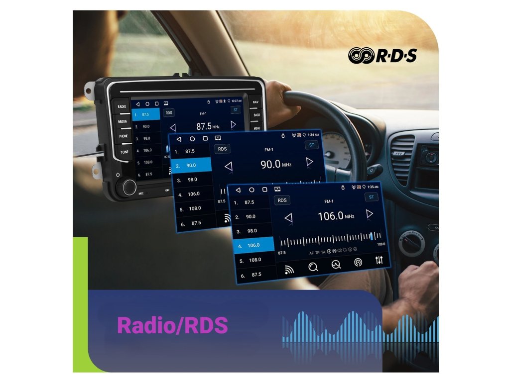 ●FM/AM/RDS rádio: Online hudbu lze přenášet do autorádia přes FM, abyste si mohli vychutnat originální autorádio, 30 přednastavených rozhlasových stanic, špičkový rádiový čip, výkonnou redukci šumu a schopnost proti rušení, podpora FM/AM Funkce RDS, Jasné vyhledávání kanálů a nízký šum