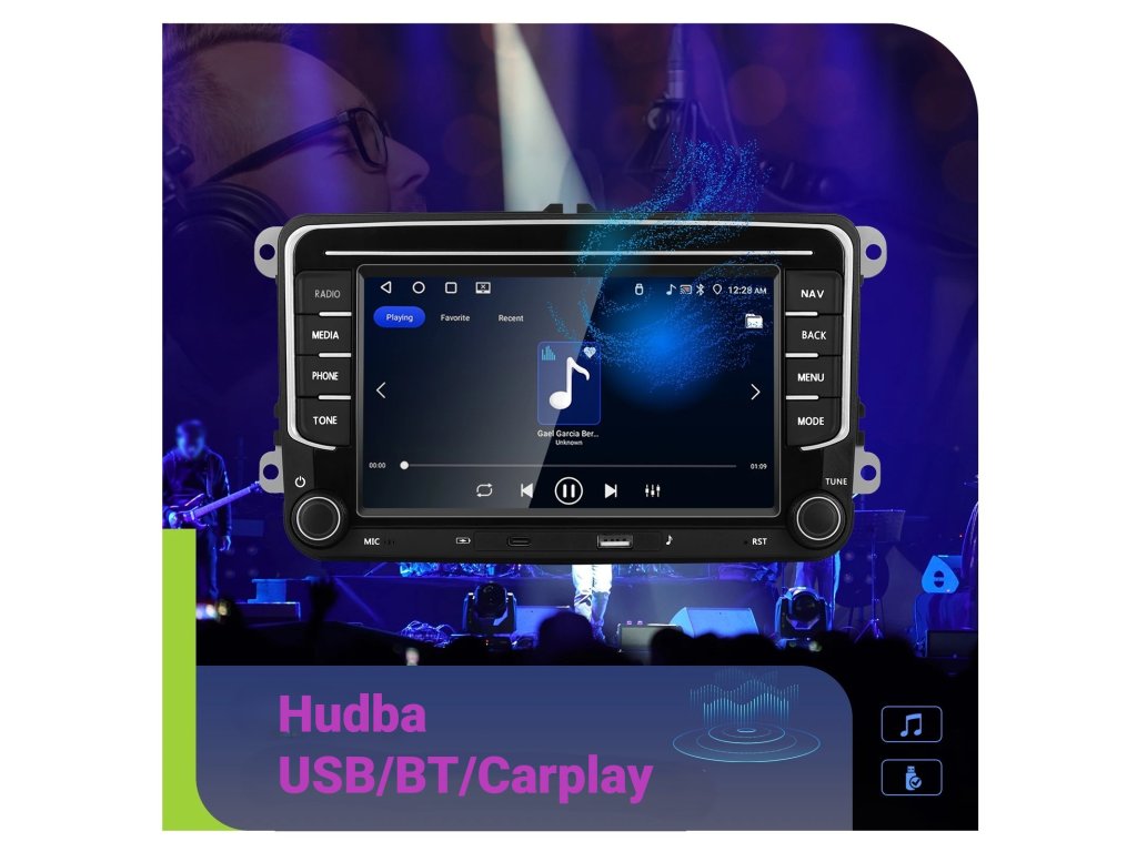 ● USB C pro nabíjení mobilního telefonu na předním panelu, USB A pro flash disk s hudbou na předním panelu rádia, kabel s USB A na zadní straně (kabel je možné schovat např. do kastlíku spolujezdce)