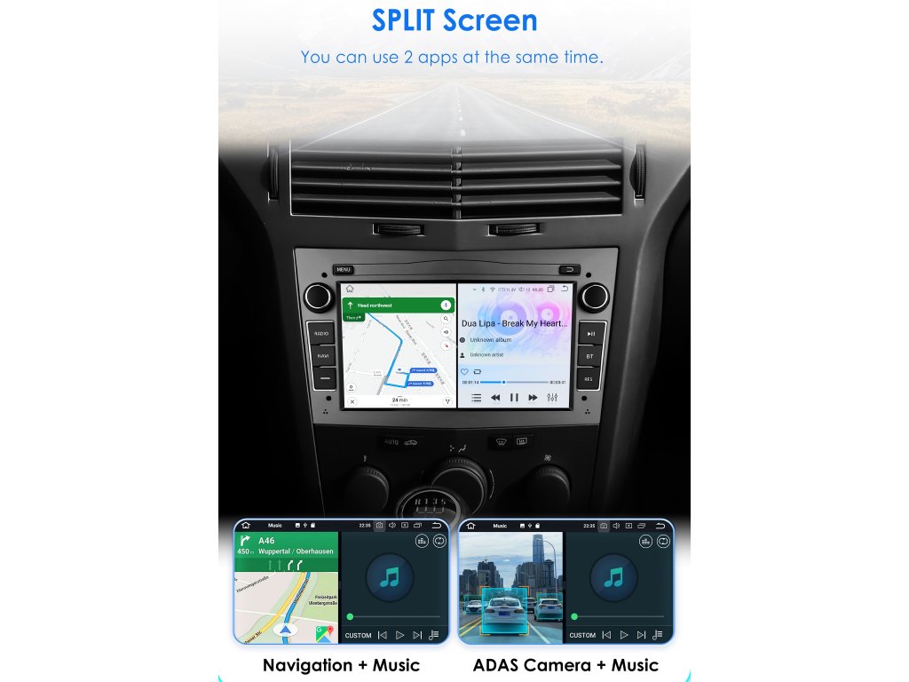 ●Funkce rozdělené obrazovky: lze zobrazit dvě stránky současně, například zobrazení navigace a hudby současně