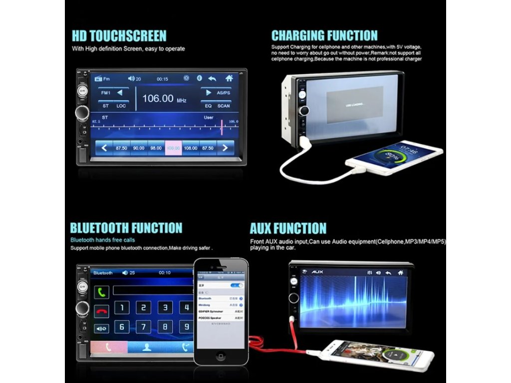 Inovativní 2DIN autorádio Podofo s možností nastavení podsvícení nabízí široké spektrum funkcí. Uživatelsky přívětivý 7" displej, který reaguje na dotyky. Bluetooth technologie umožňuje pohodlné streamování hudby a handsfree volání. Jeho výkon dosahuje vynikajících 4 × 45 W, což zajišťuje kvalitní zvukový výstup. Přední vstup AUX In, USB port a slot pro SD karty zajišťují snadné připojení většiny externích zařízení. Aplikace MirrorLink přináší snadné propojení s vaším mobilním telefonem, což umožňuje promítání obsahu telefonu na displeji. Displej může také zobrazit obraz z vaší zpětné kamery. Uživatelské menu je dostupné i v českém jazyce, což zvyšuje přístupnost a pohodlí při používání.
